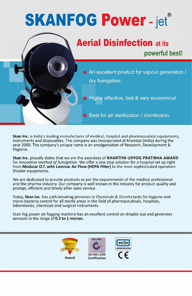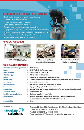 સ્વચ્છ રૂમ અને જંતુરહિત વિસ્તારોમાં ફોર્મલિન મુક્ત ધૂણી માટે ઉપયોગી આ હાઇ એન્ડ ફોગિંગ મશીન છે. તે ઝડપી, સલામત અને બિન ઝેરી ધૂણી પ્રદાન કરે છે. ફાર્માસ્યુટિકલ અને હોસ્પિટલ, મેડિકલ ફોગર મશીનો માટે. વધારાની માહિતી: • આઈટમ કોડ: AS02 • ઉત્પાદન ક્ષમતા: 1000 યુનિટ • ડિલિવરી સમય: 5 થી 7 દિવસ • પેકેજિંગ વિગતો: કોરોગ્યુટેડ બોક્સ અને થર્મોકોલ સપોર્ટમાં આવે છે