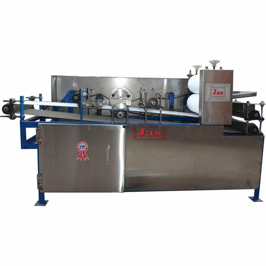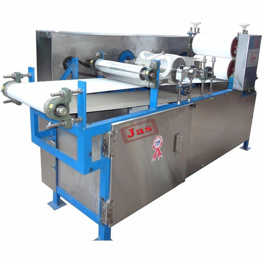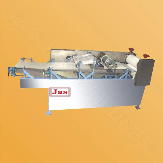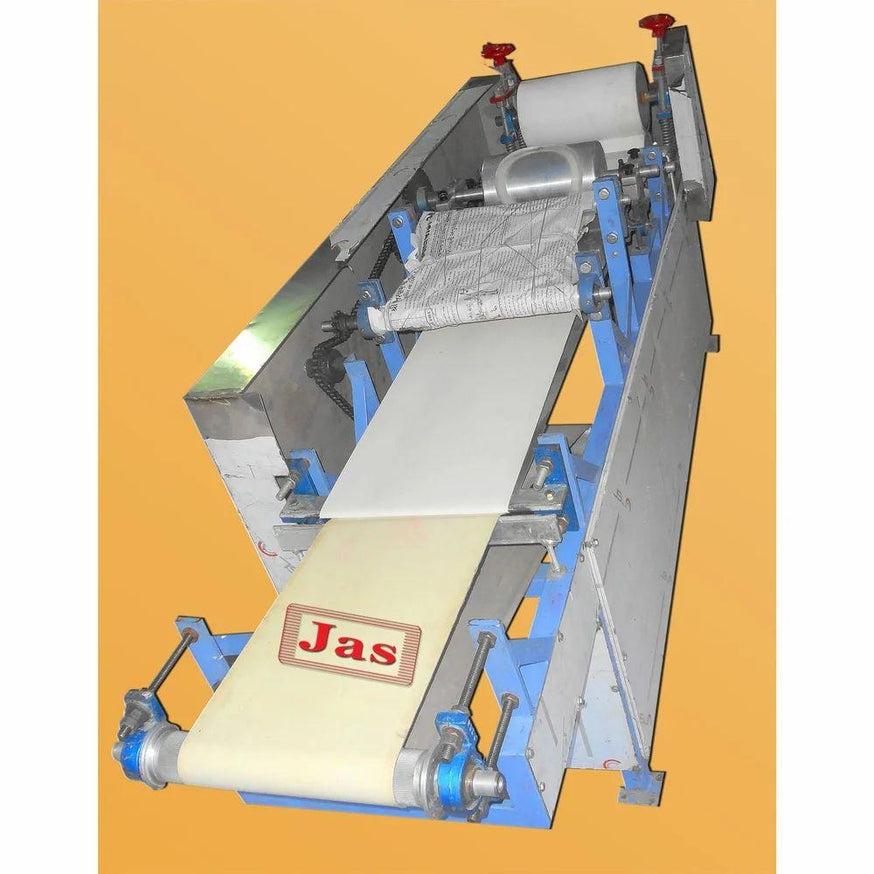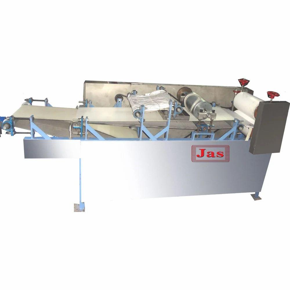 स्वचालित कच्ची चपाती और पूरी बनाने की मशीन में आटे को बस हॉपर में डालने की जरूरत होती है और आउटलेट पर कच्ची चपाती या पूरी मिलती है। इसके अलावा किसी तेल की जरूरत नहीं होती है। इस प्रकार, ये मशीनें किफायती दामों पर तेल मुक्त, स्वच्छ चपातियां प्रदान करती हैं। यह कच्ची चपाती और पूरी बनाने की मशीन उपयुक्त सिलिकॉन नियंत्रित रेक्टिफायर रेटेड डायरेक्ट करंट मोटर के साथ प्रस्तुत की जाती है जिसमें बेस स्पीड 300 से 3000 आरपीएम इलेक्ट्रिक मोटर होती है जिसमें वेरिएबल स्पीड डायरेक्ट करंट ड्राइव होती है जो आने वाले सिंगल-फेज अल्टरनेटिंग करंट वोल्ट को डायरेक्ट करंट वोल्ट में परिवर्तित करती है। इस रूपांतरण प्रक्रिया के दौरान, डीसी ड्राइव डीसी मोटर की गति, टॉर्क, वोल्टेज और करंट की स्थिति को नियंत्रित करती है। मोटाई सेटिंग व्यवस्था, आटा छिड़कने की व्यवस्था और एक नंबर डाइस रोल के साथ टेफ्लॉन कोटेड रोल का एक सेट, यह मशीन प्रति घंटे १००० से १२०० चपातियाँ या प्रति घंटे १५०० से १८०० पूरियाँ बनाने में सक्षम है, जो चपाती और पूरियों के व्यास और आवश्यक थोड़ी जगह ९८ इंच लंबाई x २४ इंच चौड़ाई x ४३ इंच ऊंचाई पर निर्भर करता है। कच्ची चपाती मेकर का ऑपरेटिंग सिस्टम: - आटा मिक्सर (आटा गूंथने की मशीन): इस मशीन में बहुउद्देश्यीय भुजाओं के साथ हेवी-ड्यूटी स्टेनलेस स्टील बॉडी होगी। पूरा भार उठाने और मिक्सर भुजाओं को नुकसान से बचाने के लिए हेवी-ड्यूटी गियर उपलब्ध कराए गए हैं। (कृपया ध्यान दें कि यह आटा गूंथने की मशीन कच्ची चपाती बनाने की मशीन का मानक हिस्सा नहीं है) आटा शीटर: आटा शीटिंग मशीन जिसमें गियरबॉक्स व्यवस्था के साथ एक मोटर द्वारा संचालित गेजिंग रोलर्स के साथ एक हेवी-ड्यूटी फ्रेम शामिल है गेजिंग रोलर्स के बीच की दूरी समायोज्य होगी और यह रोटी, चपाती या पूरी की वांछित मोटाई पर निर्भर करेगी। रोलर्स टेफ्लॉन (खाद्य ग्रेड सामग्री) लेपित होंगे। रोटरी कटिंग यूनिट में आटा शीट को खिलाने के लिए एक मध्यवर्ती कन्वेयर होगा। कन्वेयर बेल्ट खाद्य ग्रेड सामग्री का होगा। रोटरी कटिंग यूनिट: वांछित आकार के अनुसार रोटी, चपाती को सुचारू और सटीक काटने के लिए एक रोटरी कटिंग रोलर पर फिट की जाएगी। उत्पन्न चपाती के स्क्रैप को स्क्रैप संग्रह ट्रे में वापस स्थानांतरित करने का प्रावधान होगा। कच्ची चपाती बनाने की मशीन के मानक सामान: - • 1 हॉर्स पावर सिलिकॉन नियंत्रित रेक्टिफायर रेटेड डीसी मोटर • एक संख्या में डाई रोल • कच्ची चपाती बनाने की मशीन के अतिरिक्त सामान:- • आटा गूंथने की मशीन • यदि आवश्यक हो तो अतिरिक्त डाई रोल।