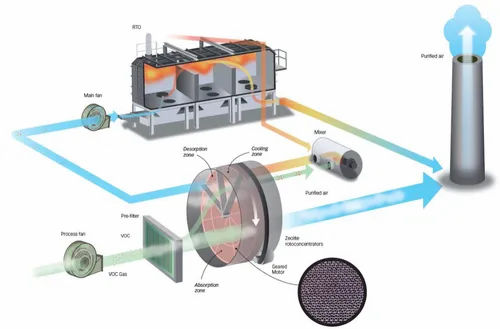 आरटीओ थर्मल ऑक्सीकरण के सिद्धांत पर काम करता है, खतरनाक गैसों को उच्च तापमान पर विघटित करता है और उन्हें वायुमंडल में छोड़ देता है। आरटीओ एक विशेष रूप से डिज़ाइन किए गए सिरेमिक बेड का उपयोग करते हैं जिसे पिछले ऑक्सीकरण चक्र से गर्म किया जाता है ताकि इनपुट गैसों को आंशिक रूप से ऑक्सीकरण करने के लिए पहले से गरम किया जा सके। पहले से गरम गैसें एक दहन कक्ष में प्रवेश करती हैं जिसे बाहरी ईंधन स्रोत द्वारा गर्म किया जाता है ताकि लक्ष्य ऑक्सीकरण तापमान तक पहुँचा जा सके जो 760 °C की सीमा में है। अधिकतम विनाश की आवश्यकता वाले अनुप्रयोगों के लिए तापमान 1,100 °C जितना अधिक हो सकता है। RIECO-TECAM RTO बहुमुखी और बेहद कुशल हैं - थर्मल दक्षता 95% तक पहुँच सकती है। इनका उपयोग नियमित रूप से उद्योगों की एक विस्तृत श्रृंखला से विलायक धुएं, गंध आदि को कम करने के लिए किया जाता है। RTO को वॉल्यूम की सीमा के लिए, मध्यम से उच्च विलायक सांद्रता के लिए और सॉल्वैंट्स की विस्तृत श्रृंखला के लिए उपयुक्त बनाया जा सकता है। वायु प्रवाह: • 10,000 से 2,00,000 m3/Hr वाष्पशील कार्बनिक यौगिक (VOC) उत्सर्जन वर्तमान में बड़ी संख्या में उत्पादन प्रक्रियाओं में वायुमंडल में जारी किए जाते हैं जो कार्बनिक पदार्थों का उपयोग करते हैं। VOC उत्सर्जन आजकल कई उद्योगों के लिए सबसे बड़ी पर्यावरणीय समस्याओं में से एक है। VOC उत्सर्जन से उत्पन्न ग्लोबल वार्मिंग CO2 द्वारा उत्पादित वार्मिंग से 12 गुना अधिक है VOCs और गंध को खत्म करने की प्रौद्योगिकियाँ: • ऑक्सीडाइज़र • फ़िल्टर • स्क्रबर • सोखना प्रणाली • DeNOx प्रणाली • ऊर्जा दक्षता प्रणाली तकनीकी विशेषताएं: • अधिकतम विलायक सांद्रता: 11,000 mg/Nm3 • ऑटो-थर्मल ऑपरेशन के लिए विलायक सांद्रता: 1.3-1.7 g/Nm3 • आरटीओ उपकरण का परिचालन तापमान 750 डिग्री सेल्सियस से ऊपर है और यह कुछ अनुप्रयोगों के लिए 1100 डिग्री सेल्सियस तक पहुंच सकता है। • सिरेमिक मीडिया का लंबा जीवन होता है। • ऊर्जा की बचत और थर्मल दक्षता के लिए आंतरिक अलगाव > 98% है। उद्योग: • रासायनिक • पेट्रोकेमिकल • ऑटोमोटिव • फार्मास्युटिकल • तेल और गैस • पैकेजिंग • फ्लेक्सोग्राफिक • कोटिंग के फायदे: • छोटे, मध्यम और बड़े वायु प्रवाह के लिए अनुकूलनीय • उपचारित किए जाने वाले वीओसी उत्सर्जन की विस्तृत श्रृंखला • कम परिचालन और रखरखाव लागत • उच्च थर्मल दक्षता • कोई अपशिष्ट उत्पन्न नहीं करता है • बाहरी प्रक्रियाओं के लिए उत्पन्न गर्मी वसूली। अनुप्रयोग: • पेंटिंग और छिड़काव बूथ • औद्योगिक परिष्करण • कोटिंग प्रक्रियाएं वाष्प और गैसें अतिरिक्त जानकारी: • आइटम कोड: RI • उत्पादन क्षमता: 10000 • डिलीवरी का समय: विनिर्माण मंजूरी से 12 सप्ताह • पैकेजिंग विवरण: लकड़ी का बक्सा