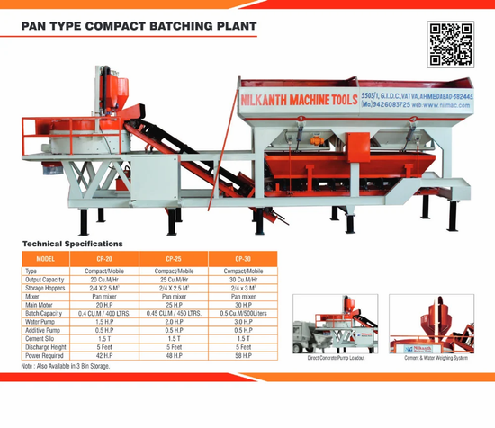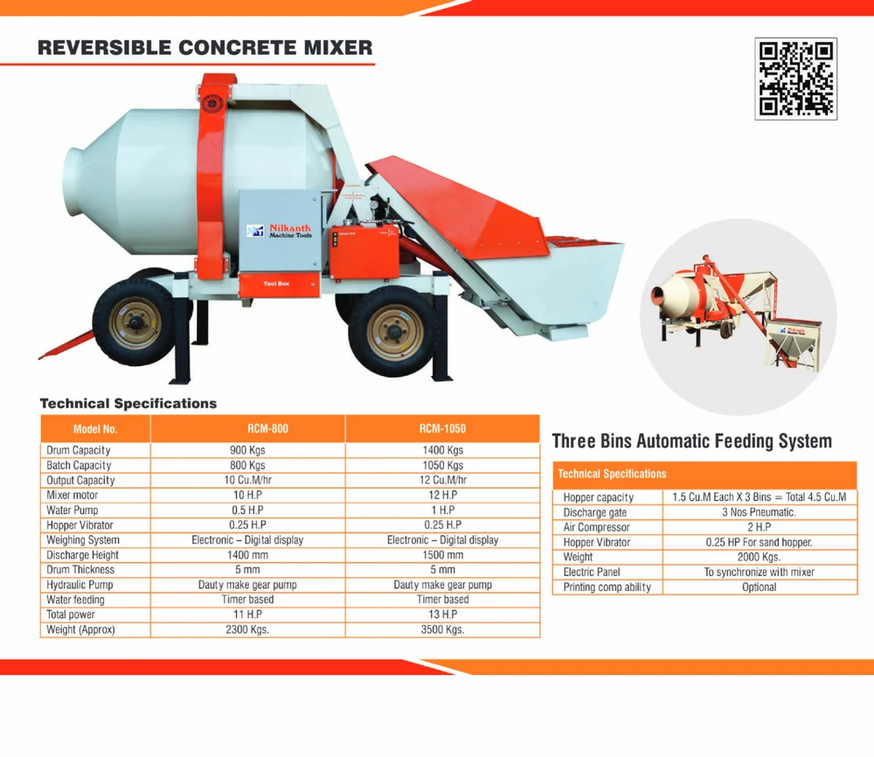विशिष्टताएँ: मॉडल संख्या इकाई आर.सी.पी.-15 ड्रम क्षमता लीटर 600 बैच क्षमता लीटर 400 आउटपुट * घन मीटर/घंटा 10 प्राइम मूवर एच.पी. 10 एच.पी. वाटर पंप एच.पी. 1 हॉपर वाइब्रेटर - 0.25 गाइड रोलर संख्या 3 वायवीय टायर - 600 x 16 4 नं लोडिंग हॉपर - हाइड्रोलिक संचालित वजन प्रणाली - इलेक्ट्रॉनिक डिजिटल ड्रम आयाम मिमी 1310 व्यास x 1540 एल मिक्सिंग ड्रम आर.पी.एम. 16 कुल शक्ति एच.पी. 12 वजन किलोग्राम 2400