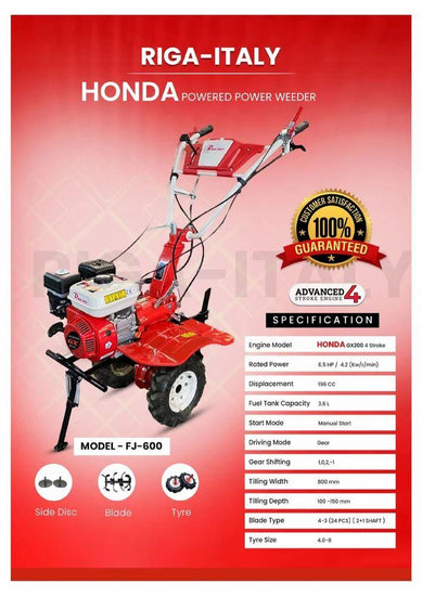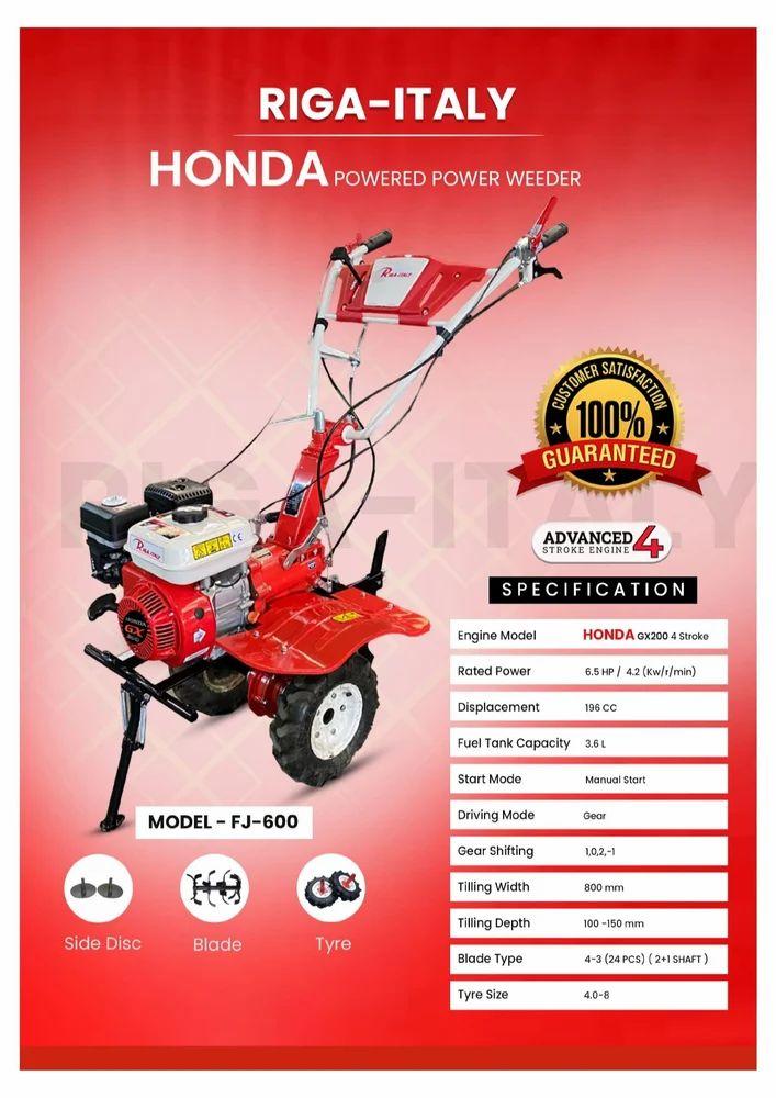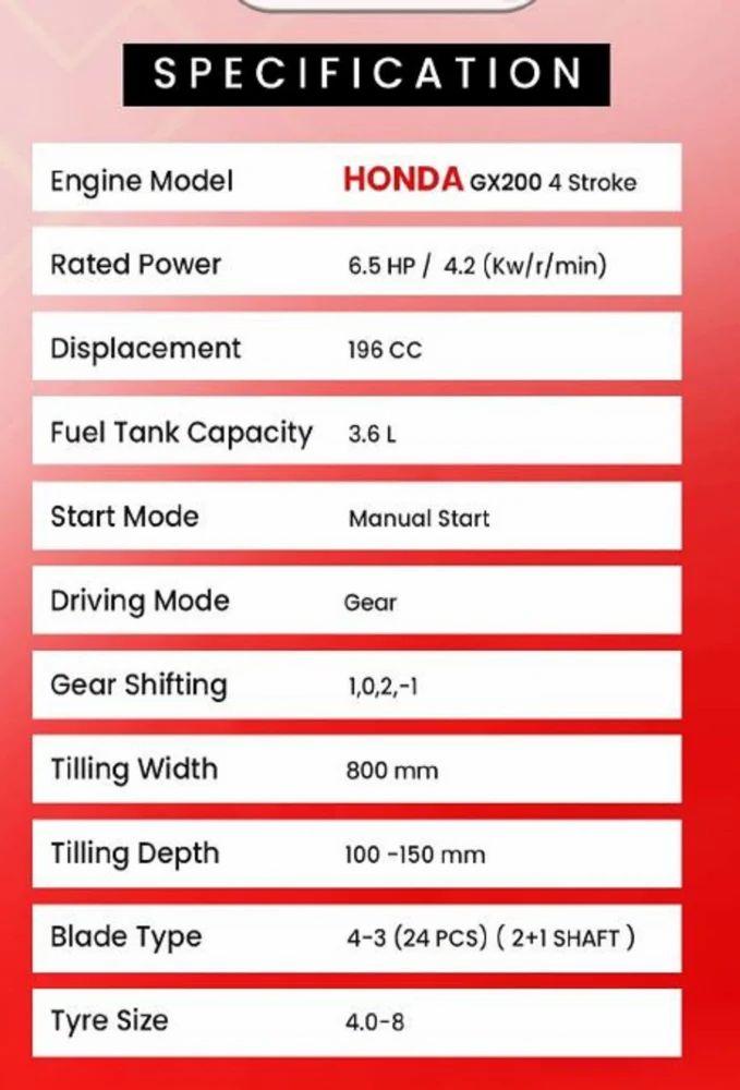 इंजन मॉडल-होंडा GX200 4 स्ट्रोक रेटेड पावर-6.5 HP/4.2 (Kw/r/min) डिस्प्लेसमेंट-196 CCF्यूल टैंक क्षमता-3.6L स्टार्ट मोड-मैनुअल स्टार्ट ड्राइविंग मोड-गियर गियर शिफ्टिंग-1,0,2,-1 टिललिंग चौड़ाई-800 mm टिललिंग गहराई-100-150 mm ब्लेड टाइप-4-3 (24 PCS) (2+1 शाफ्ट) टायर साइज-4.0-8 अतिरिक्त जानकारी: • डिलीवरी का समय: 3 दिन