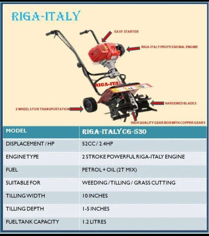 मॉडल-रीगा-इटलीCG-530डिस्प्लेसमेंट/HP-52CC/2.4HPइंजन टाइप-2स्ट्रोक पावरफुल रीगा-इटली इंजनईंधन -पेट्रोल + तेल (2T मिक्स)खरपतवार हटाने/जुताई/घास काटने के लिए उपयुक्तजुताई की चौड़ाई-10 इंचसिलाई की गहराई-1-5 इंचफुल टैंक क्षमता -1.2 लीटरअतिरिक्त जानकारी: • डिलीवरी का समय: 3 दिन