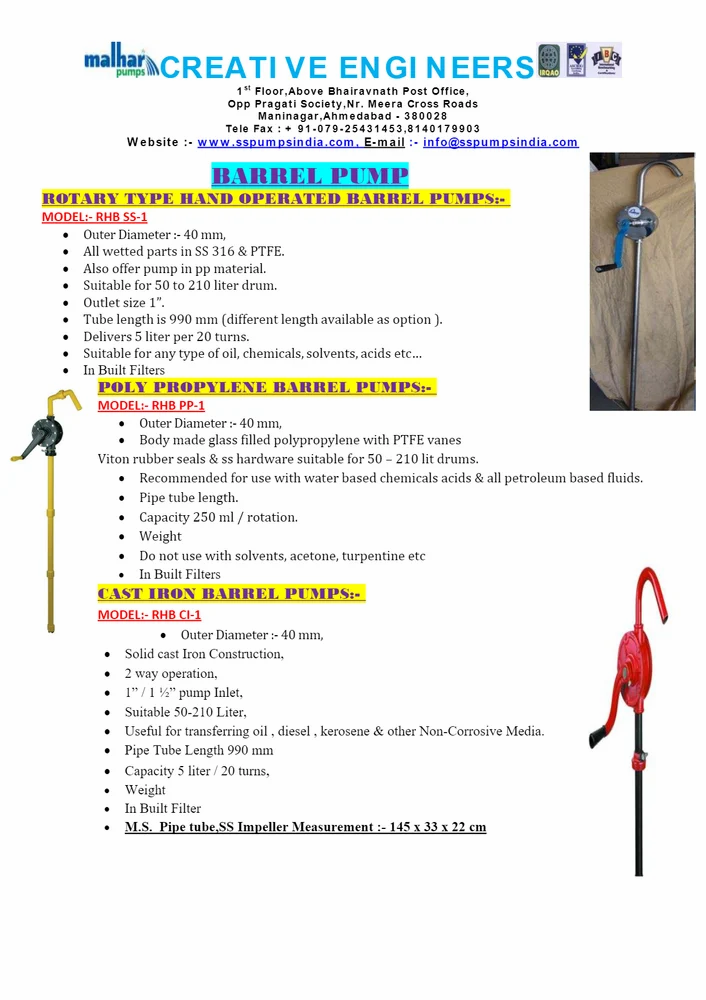 पॉली प्रोपलीन बैरल पंप:- मॉडल:- RHB PP-1 • · बाहरी व्यास:- 40 मिमी, • · PTFE वैन के साथ ग्लास से भरी पॉलीप्रोपाइलीन बॉडी। • 50 - 210 लिट ड्रम के लिए उपयुक्त विटन रबर सील और एसएस हार्डवेयर। • · पानी आधारित रसायन एसिड और सभी पेट्रोलियम आधारित तरल पदार्थों के साथ उपयोग के लिए अनुशंसित। • · पाइप ट्यूब की लंबाई। • · क्षमता 250 मिली / रोटेशन। • · वजन • · सॉल्वैंट्स, एसीटोन, तारपीन आदि के साथ उपयोग न करें • · इन-बिल्ट फ़िल्टर अतिरिक्त जानकारी: • आइटम कोड: RHBPP1 • प्रेषण बंदरगाह: अहमदाबाद • उत्पादन क्षमता: प्रति सप्ताह 100 पीस • डिलीवरी का समय: 2 दिन • पैकेजिंग विवरण: निर्यात योग्य