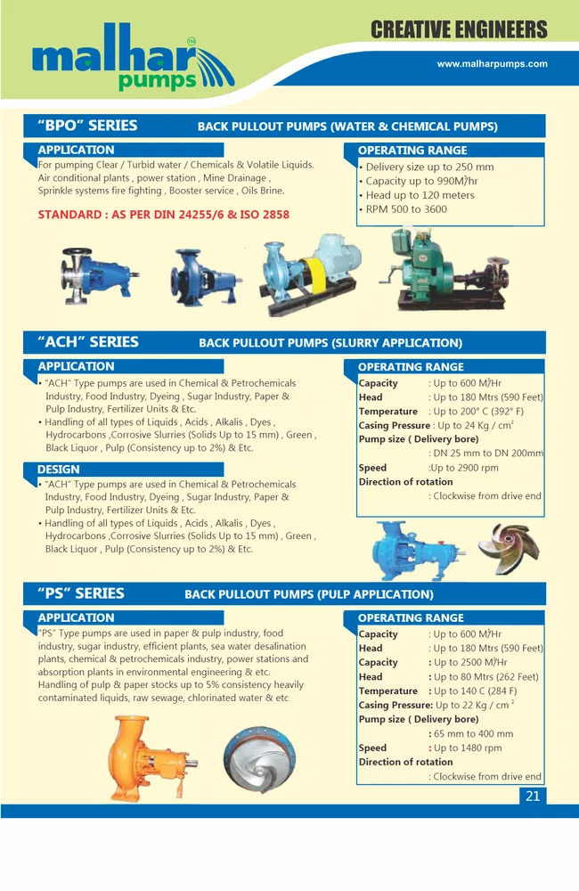 Applications: • “ACH” type pumps are used in chemical & petrochemicals industry, food industry, dyeing, sugar industry, paper & pulp industry, fertilizer units & etc. • Handling of all types of liquids, acids, alkalis, dyes, hydrocarbons, corrosive slurries (solids up to 15 mm) , green, black liquor, pulp (consistency up to 2%) & etc. Operating range: CapacityUp to 600 M3/HrHeadUp to 180 Mtrs (590 Feet)TemperatureUp to 200° C (392° F)Casing PressureUp to 24 Kg / cm2Pump size ( Delivery bore)DN 25 mm to DN 200 mmSpeed Up to 2900 rpmDirection of rotation Clockwise from drive end
