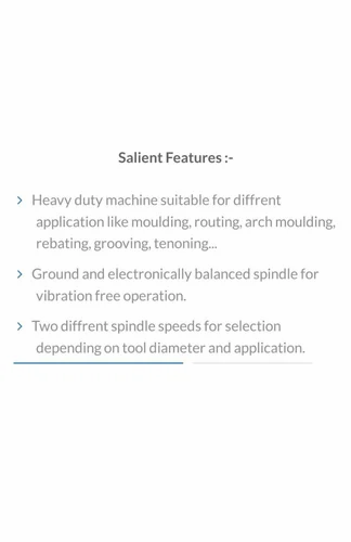 Salient Features: Heavy duty machine suitable for diffrent application like moulding, routing, arch moulding, rebating, grooving, tenoning... Ground and electronically balanced spindle for vibration free operation. Two diffrent spindle speeds for selection depending on tool diameter and application. Other Details: The hard anodized 1300mm alluminum extrusion sliding table is precision machined and features a 360mm wide table. A heavy duty mitre fence with wood clamping for tenoning work and an alluminum extruded adjustable side reference fence. Auto Feeder: (Optional) For auto feeding of workpiece & can be bought any time separately Additional Information: • Production Capacity: READY • Delivery Time: 1 MONTH • Packaging Details: POLYTHIN PACKING