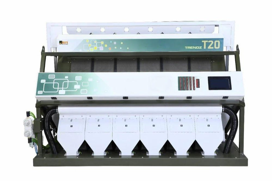 Ø378 channels – 6 Chute ØMatrix Valves ØFPGA Digital Processor Technology. ØTrichromatic RGB Camera 5400 x 3 Pixel ØOutput 3 to 4 TPH ØAir: 108 CFM - 30HP Compressor. ØChannels Distribution - Primary-4, Secondary-1, Final-1 ØProducts: Rice, Dhal, Pulses, Grains, Spices & Plastics