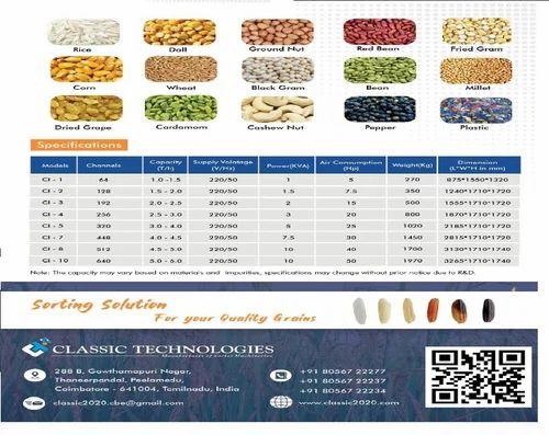 Features: Camera: Precise image scanning with 16200 Pixel lens with 20,000 scans per second. Electronic: Precise image scanning with 16200 Pixels lens. Technology: Highly integrated real time automated (IoT) technology and 3d recognizing technology for accurate identification of material. Interior Design: Special design for sorting colour and shape to ensure accuracy. Services: Self-diagnosis and self-tuning technology for easy serviceability, Low maintenance and less power consumption. Quality: We provide outstanding products and unsurpassed service that, together, deliver, premium value to our customer. Interface: User friendly options on touch screen for easy access of the interface. Electro: Electro-magnetic ejector for accurate flow of air. Uniform: Uniform flow feeder for uninterrupted inputs. Additional Information: • Delivery Time: Immediate