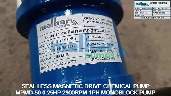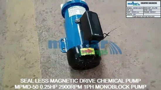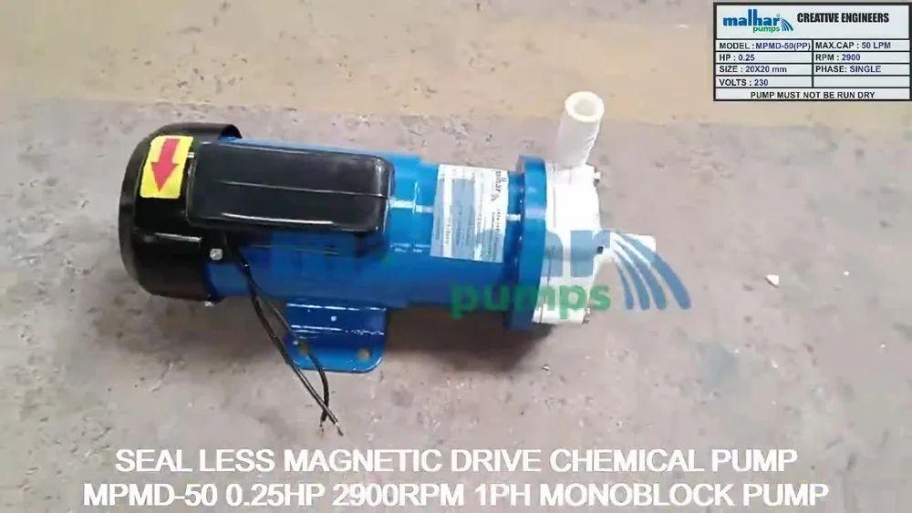 We are offering of Seal Less Pump. Magnetic drive design eliminates the conventional method of shaft coupling. Hence the pump casing is fully sealed from drive end which gives away the use of conventional sealing system. There is no seal used and hence no troublesome seal repairing and replacement, leakage and production lost. Impeller and drive magnets are permanent rare earth magnets. They prevent slippage and ensure that full motor horsepower is converted into pumping power. • All pumps are rated for continuous duty with class “e” insulation. • All pumps are centrifugal semi-open impeller type pumps and need priming before start up. • Ss-316 magnetic pumps are available upto 5 hpFeatures: • 100% leak proof pumps due to magnetic drive arrangement. No shaft seal used which automatically solves problems of seal leakage and wear & tear. Friction free operation for reduced power consumption. High power permanent magnets ensure full power transfer and eliminates slippage. All pumping parts are non-metallic, which gives superior corrosion resistance, simple and easy to operate and maintain. Long life, reliable and trouble free operation. Applications: • Ideal for transfer of corrosive chemicals, plating chemicals, acids, dyes, solvents, toxic & fuming liquids, petrol, kerosene etc. Useful in chemical industries, pharmaceuticals and food processing industries. Electroplating, galvanizing / anodizing plants. Laboratory equipments and pcb plants. Medical equipment and x-ray film plants. Textile dyeing houses. Liquid dispensing machines and chemical filtration equipment. For hazardous duty conditions with flame proof motors. High efficiency due to permanent magnet power coupling.