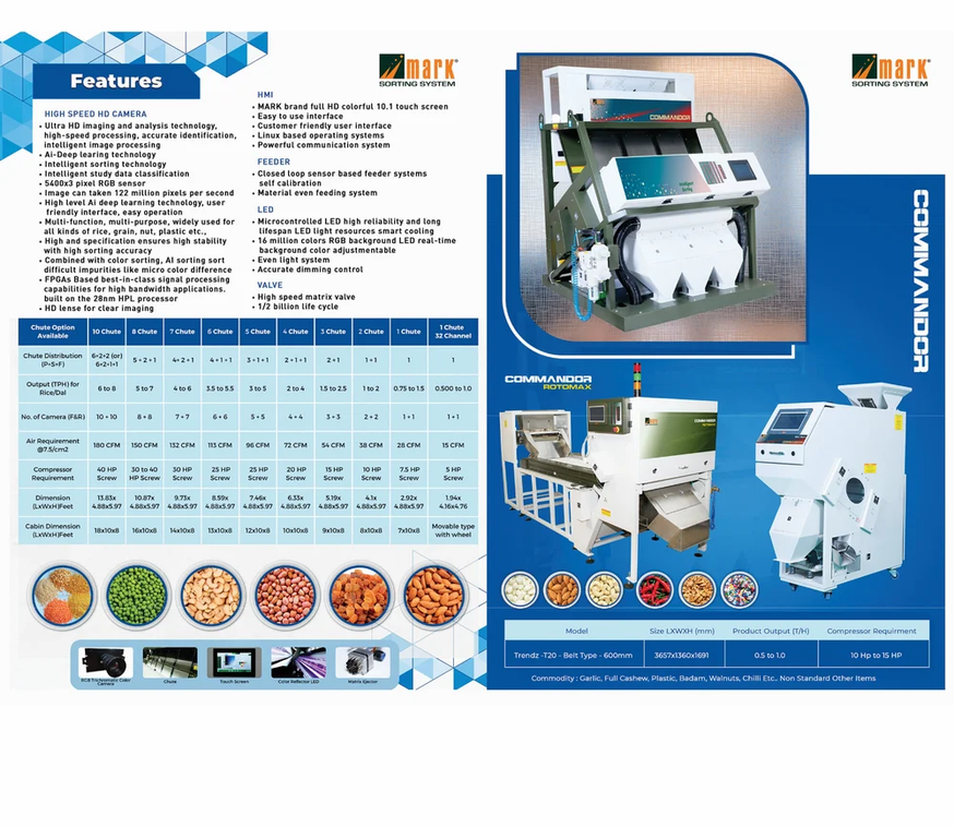 Ø 630 channels – 10 Chute Ø Matrix Valves Ø FPGA Digital Processor Technology Ø Trichromatic RGB Camera 5400 x 3 Pixel Ø Output 5 to 7 TPH Ø Air: 180 CFM - 40HP Compressor. Ø Channels Distribution – Primary -5, Secondary-2, Final-1 Ø Products: Rice, Dhal, Pulses, Grains, Spices & Plastics Note: Using Advanced Artificial Intelligence & High Image Scanning Technology for Accurate Sorting Purposes. * High Speed & High Accuracy * Increased Efficiency * Cost Savings * Enhanced Sorting Capabilities * Remote Monitoring and Control Additional Information: • Production Capacity: 3TPH • Delivery Time: 1 WEEK