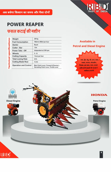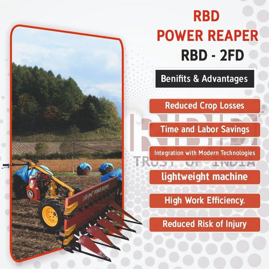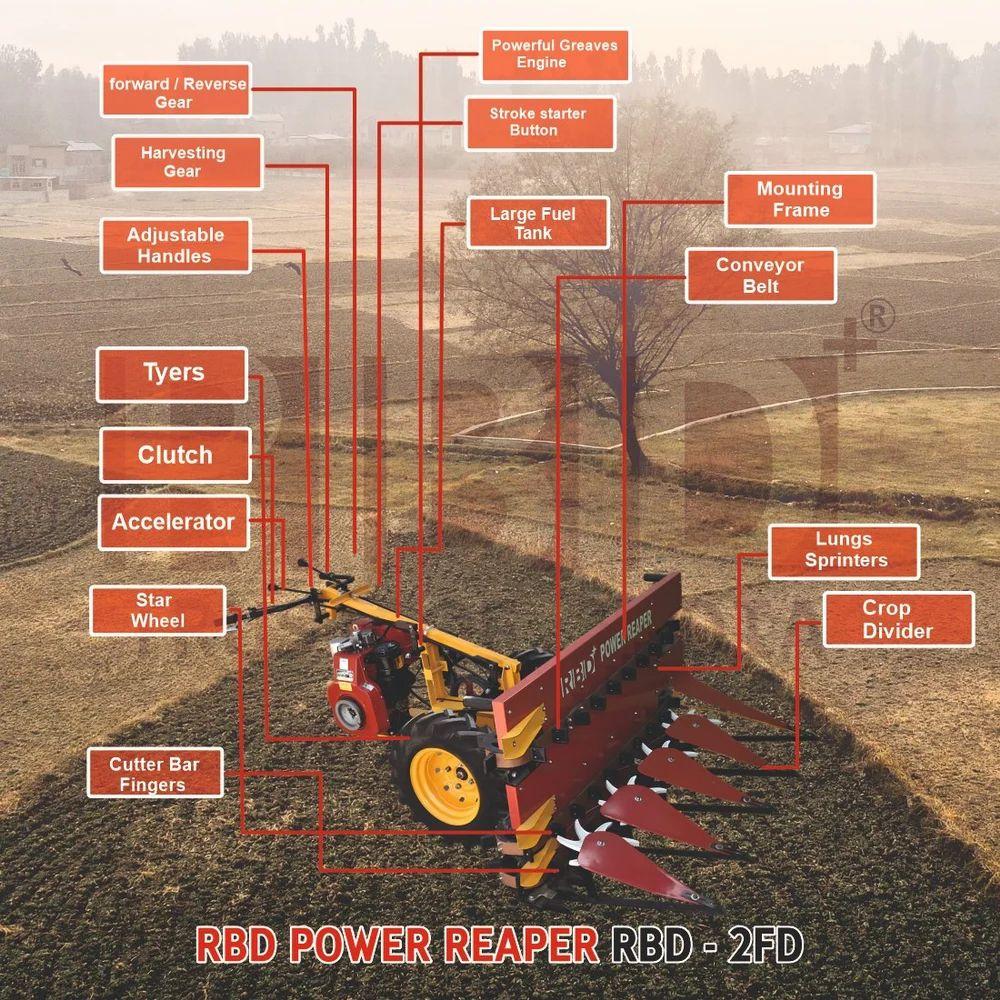 An agriculture power reaper is a versatile and efficient harvesting machine designed to streamline the process of cutting and gathering crops in the field. This mechanized tool is crucial for farmers, offering increased productivity and reducing the labor-intensive nature of manual harvesting. Here's a detailed description of an agriculture power reaper: 1. Cutting Mechanism: • The heart of the power reaper lies in its cutting mechanism. Equipped with a robust blade or sickle bar, the machine efficiently cuts through standing crops such as wheat, rice, or barley at the desired height. 2. Engine Power: • Powered by a reliable internal combustion engine, the power reaper provides the necessary energy to drive the cutting and threshing components. This ensures consistent performance and efficiency in various field conditions. 3. Threshing Unit: • Beyond cutting, the power reaper often incorporates a threshing unit. This component separates the grains from the harvested crop. Threshing mechanisms may include beaters, blades, or other elements designed to efficiently extract the grains. 4. Gathering Reel or Conveyor: • A gathering reel or conveyor system collects the cut crops and transports them towards the threshing unit. This feature ensures a smooth flow of harvested material for efficient processing. 5. Grain Collection and Storage: • Once threshing is complete, the machine features a grain collection system that gathers and stores the separated grains. This collected material is either deposited in bags or bins for further processing or storage. 6. Adjustable Settings: • Many modern power reapers come with adjustable settings, allowing farmers to customize the cutting height and other parameters based on the specific crop and field conditions. 7. Mobility: • Power reapers are often mounted on wheels or are self-propelled, enhancing mobility in the field. This feature allows farmers to navigate through the crops with ease and efficiently cover large areas during the harvesting process. 8. Operator Controls: • The machine is equipped with user-friendly controls accessible to the operator. Levers, switches, and adjustable settings enable the operator to manage the cutting and harvesting process efficiently. 9. Durability: • Constructed with durable materials such as steel and reinforced components, power reapers are designed to withstand the rugged conditions of agricultural use. This durability ensures longevity and reliability in the field. 10. Safety Features: - Safety is a top priority, and power reapers incorporate features such as guards and emergency shut-off mechanisms to protect the operator during operation. Agriculture power reapers play a pivotal role in modern farming practices, offering increased efficiency, reduced manual labor, and enhanced productivity during the crucial harvest season. Additional Information: • Item Code: RBD-2FDH • Production Capacity: 1000 • Delivery Time: 1 • Packaging Details: very good