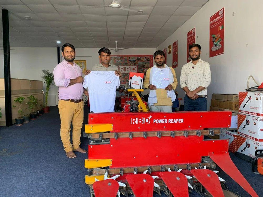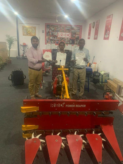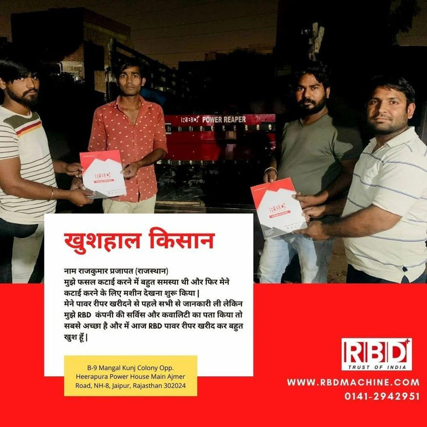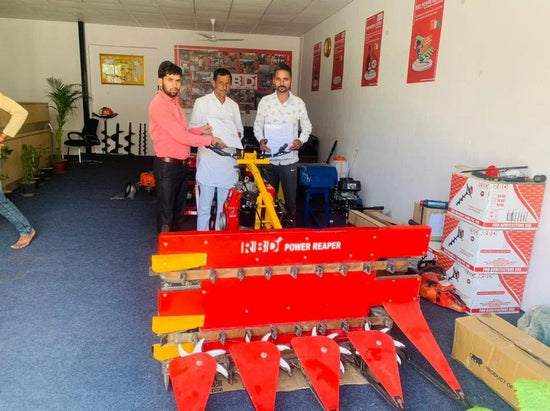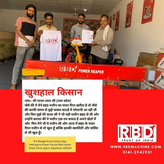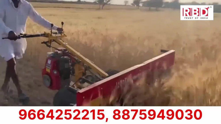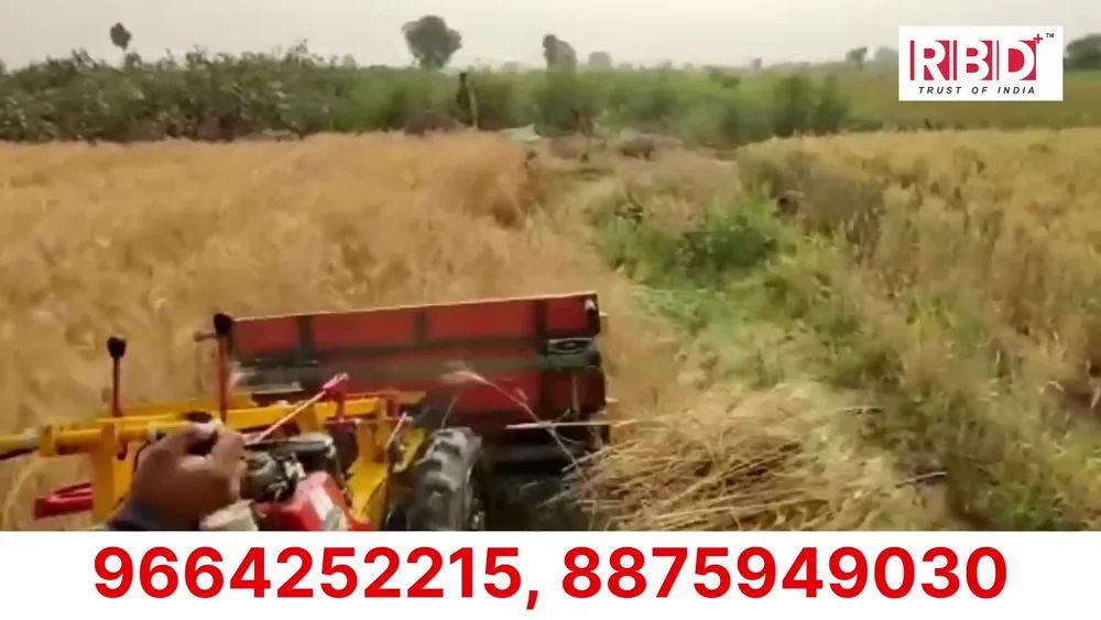 Harvesting is gathering ripened crop from agriculture field. This process requires more human power, so you need to spend more for labor. An Agriculture Reaper machine helps to ease your work and save labour cost. The power reaper is agriculture machinery that help to harvest crops when they are ripe. It is a multipurpose machine that packs many functions into a small and manageable body. Easily cut and harvest various crops with less effort. This machine has large and wide tyres which make it balance for different types of terrain and uneven surfaces. Whether you have plain surface farm, sloping field or a rocky surface this reapers make the job easy. It is a man held and self-propelled reaper and also used as a paddy harvester / Wheat Harvestor machine for harvesting paddy from the field. Benefits of Power Reaper • Simple to use controls: Manual handling machine does not require separate machines for mounting. • Cost effective and saves time. • Light weighted machine so that it is easy to handle • Suitable for various crops like Bengal Gram, Black Gram, Green Gram, Wheat, Soybean Mustard and Paddy etc. • This machine replaces the labour up to maximum, so it saves labour cost. RBD machine Power Reaper is a self-propelled reaper with rotary blades which helps to cut crops effectively. And we have reaper binder machine does harvesting and binding works at a time so it will reduce your binding work along with harvesting. Specifications RBD-3FD ( Diesel ) • Rated Power: 4.8 kW (5 hp) • Displacement: 270 cc • Speed: 3600 RPM • Engine/Fuel: Diesel • Fuel Tank Capacity: 5.0 L • Fuel Consumption: 700 ml/h • Cutting Width: 92.8 – 101.1 cm • Cutting Height: 32 mm • Productivity: 5-7.5 hr/ha power reaper, rbd power reaper, gehu katne ki machine, sarso katne ki machine, sarso katne wali machine, wheat reaper, Additional Information: • Production Capacity: 200 • Delivery Time: On Time • Packaging Details: Good