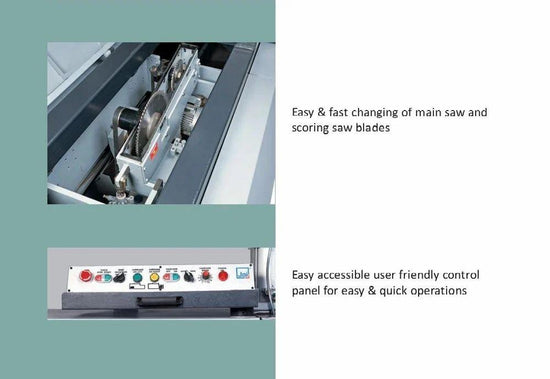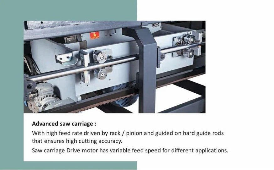 Salient Features: Maximum cutting thickness up to 60 mm A uniform holding pneumatic clamping beam ensuring synchronized cylinder actuation at both ends Saw Carriage Drive Motor has variable feed speed for different applications