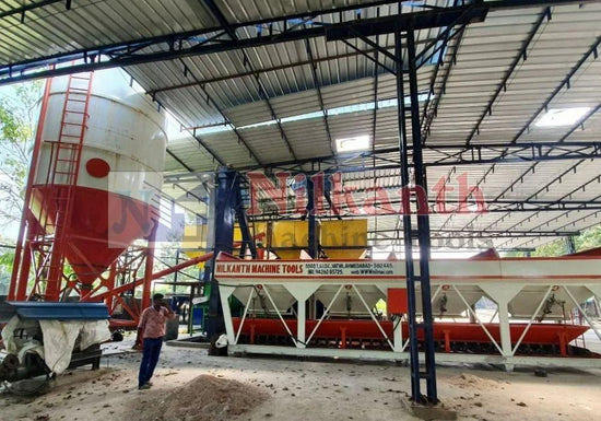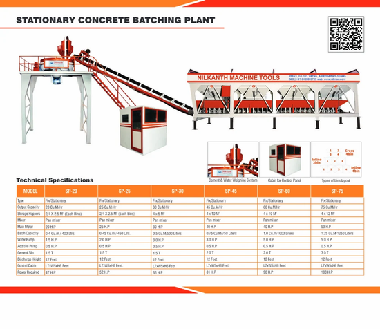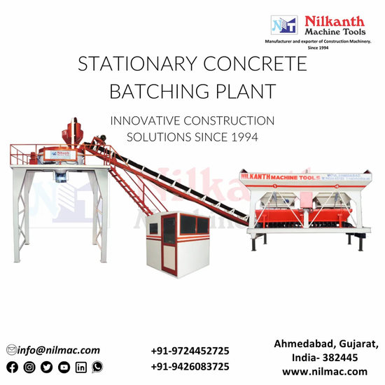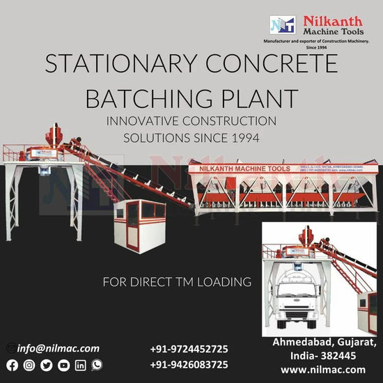 Stationary concrete batching plant for direct transit mixer loadout at height. Mixer type- Pan mixer / Twin shaft mixer. Output capacity- 20, 25, 30, 45, 60 & 75Cu. M/Hr.