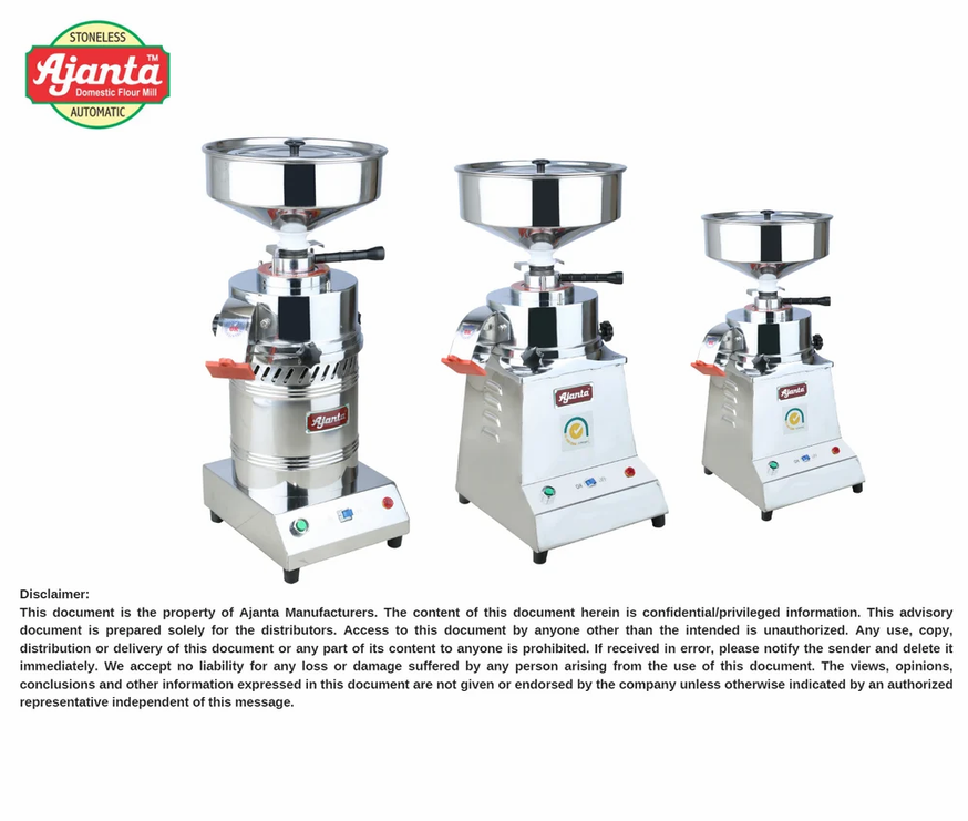 Table Top Flour Mill is a perfect and easy-to-use product for grinding wheat, rice and other similar grains. The design of this mill is very simple. The material that has been used in the construction of this mill is stainless steel, and hence it is very durable. Brand Ajanta Availability in stock Product Type Semi Automatic Flour Mill Sub_Type Square Table Top Atta Chakki Material Stainless Steel Production Capacity Flour capacity 4 to 6 Kg per Hour Dal capacity 8 to 10 Kg per Hour