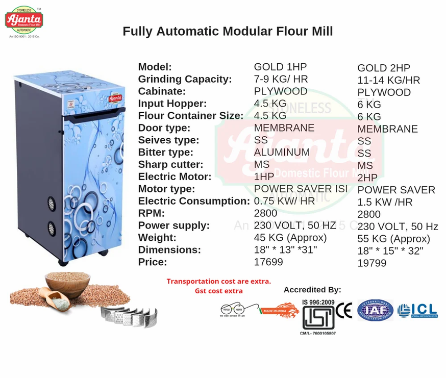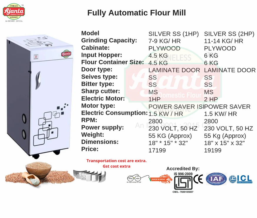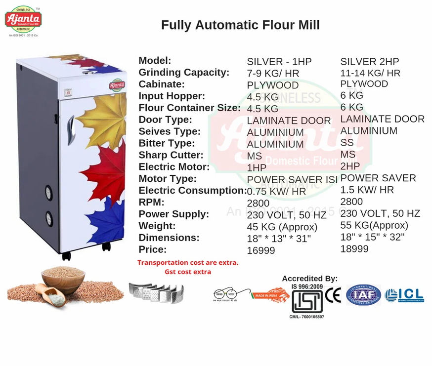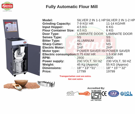 Model: SILVER VACUUM -1HP Grinding Capacity:7-9 KG/ HR Cabinate: PLYWOOD Input Hopper:4.5 KG Flour Container Size:4.5 KG Door Type: LAMINATE DOOR Seives Type: ALUMINIUM Bitter Type: ALUMINIUM Sharp Cutter: MS Electric Motor:1HP Motor Type: POWER SAVER ISI Electric Consumption:0.75 KW/ HRRPM:2800 Power Supply:230 VOLT, 50 HZ Weight:45 kg (Approx) Dimensions:18" * 13" * 31" Price:12500 Additional Information: • Production Capacity: 15 KG • Delivery Time: DEPEND PINCOD • Packaging Details: CAROGAT BOX
