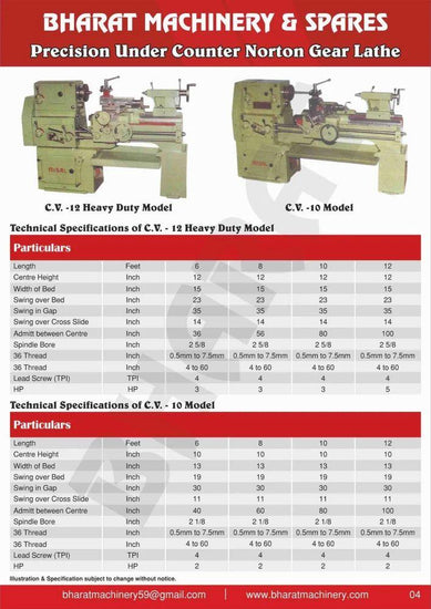 With an aim to fulfill varied requirements of our valued clients, we are engaged in offering Under Counter Lathe Machine. The machine is manufactured following the OEM standards. This machine plays a vital role in a machine or machinery parts manufacturing units. The offered machine is used for developing several small and general parts of the machines. At our unit, we fabricate ensuring high accuracy and wear-tear resistance. Features: • Hard tooth and abrasion resistance • Smooth finish and stone fixing • No vibration and accurate performanceApplications: • Gearbox manufacturers • Feeding machinery • Automotive engineering parts • Agricultural machinerySpecifications: Length of Bed6'6" (2000)8'6" (2550)Width of bed13½" (340)13½" (323)Height of Center10½" (265)10½" (254)Swing over Bed20½" (525)20½" (500)Swing over Carriage12½" (320)12½" (305)