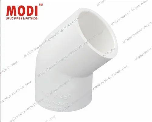 Modi UPVC Fittings are manufactured with high precision "Injection Molding" machines using high quality PVC Raw MaterialModi UPVC 45° Elbow is available in Sch-80 and is manufactured conforming to standards of ASTM D 2467 & is used for cold water application and for leakage free joints.
