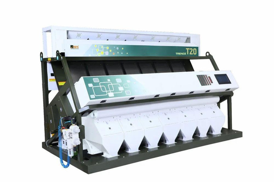Ø441 channels – 7 Chute ØMatrix Valves ØFPGA Digital Processor Technology ØTrichromatic RGB Camera 5400 x 3 Pixel ØOutput 3.5 to 4.5 TPH ØAir: 126 CFM - 35HP Compressor. ØChannels Distribution - Primary- 4, Secondary-2, Final-1 ØProducts: Rice, Dhal, Pulses, Grains, Spices & Plastics