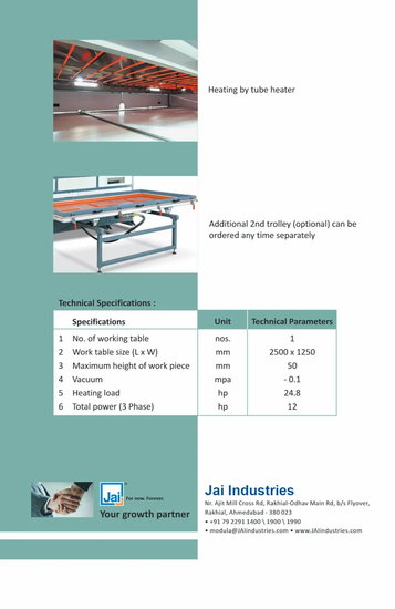 • Used for applying a uniform lamination of PVC, decorative papers and veneer till 0.4 mm on top surface and borders on flat & designed work piece having smooth shape • Vacuum wrapping technology having single table • Lamination of PVC foil on one side of MDF, particle board & solid wood • Silicon membrane offered for veneer application • Short pressing cycles • More efficient, stable and long life high grade 3 hp - GERMAN vacuum pump, which reduce the cycle time with more effective pressing. • Silicon membrane sheet is standard supply with the machine • We will provide one set of tray minimizer for optimum usage of work tray along with the machine