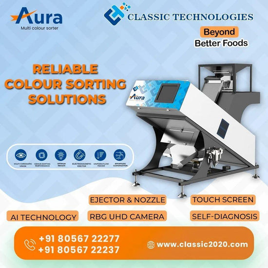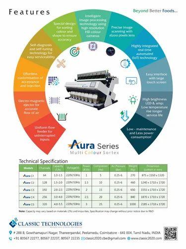 Features: Camera: Precise image scanning with 16200 Pixel lens with 20,000 scans per second. Electronic: Precise image scanning with 16200 Pixels lens. Technology: Highly integrated real time automated (IoT) technology and 3d recognizing technology for accurate identification of material. Interior Design: Special design for sorting colour and shape to ensure accuracy. Services: Self-diagnosis and self-tuning technology for easy serviceability, Low maintenance and less power consumption. Quality: We provide outstanding products and unsurpassed service that, together, deliver, premium value to our customer. Interface: User friendly options on touch screen for easy access of the interface. Electro: Electro-magnetic ejector for accurate flow of air. Uniform: Uniform flow feeder for uninterrupted inputs. Additional Information: • Delivery Time: immediate