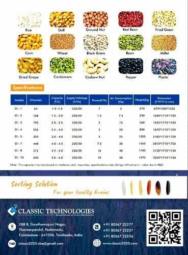 Features: Camera: Precise image scanning with 16200 Pixel lens with 20,000 scans per second. Electronic: Precise image scanning with 16200 Pixels lens. Technology: Highly integrated real time automated (IoT) technology and 3d recognizing technology for accurate identification of material. Interior Design: Special design for sorting colour and shape to ensure accuracy. Services: Self-diagnosis and self-tuning technology for easy serviceability, Low maintenance and less power consumption. Quality: We provide outstanding products and unsurpassed service that, together, deliver, premium value to our customer. Interface: User friendly options on touch screen for easy access of the interface. Electro: Electro-magnetic ejector for accurate flow of air. Uniform: Uniform flow feeder for uninterrupted inputs. Additional Information: • Delivery Time: immediate